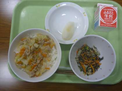 今日は、ねぎ塩豚丼・ひじきのピリッとサラダ・梨・牛乳です。