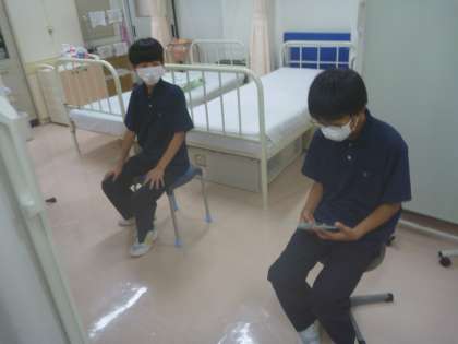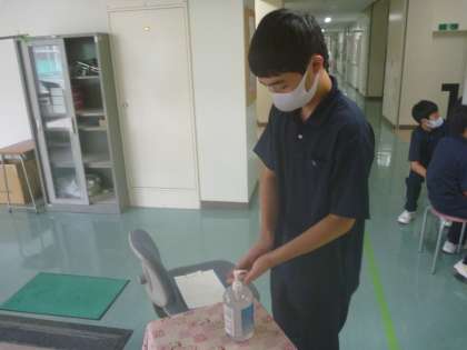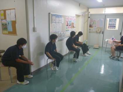 待っている廊下でも、校医さんに見て頂く前の保健室内もソーシャルデイスタンス。検診後、教室に戻る前に、手を消毒しました。