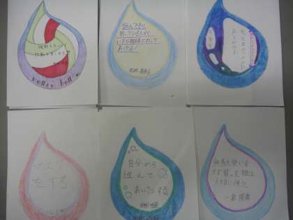 最後に「しずく」の形の絵を書き、「いつも笑顔ですごす」「無駄使いをせず、買ったものは大切に行う」「悩んでたり、困っている人がいたら相談にのってあげる!」「世界中の人達がコロナ対策をして感染者をゼロ0にする」など書きました。みんなの書いたものをしずくの形にして、廊下に掲示します。