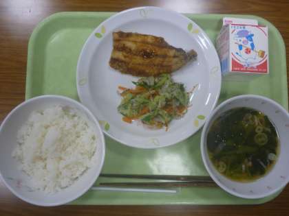 ご飯・みそ汁・鰯のかば焼き・野菜のゆかり和え・牛乳です。