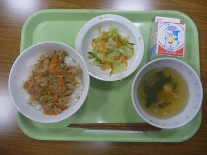豚肉の甘みそ丼・すまし汁・野菜の即席漬け・牛乳です。