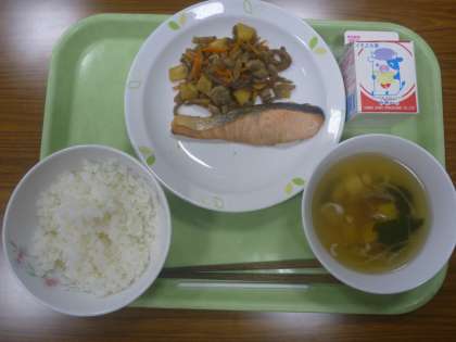 ご飯・すまし汁・鮭の香草焼き・芋きんぴら・牛乳です。