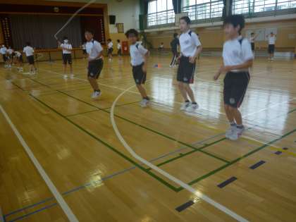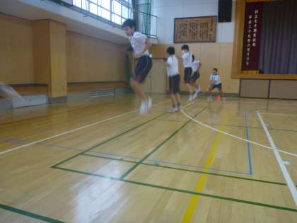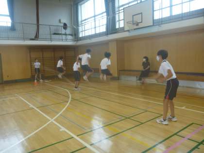 10月24日の運動会の種目の大縄跳びは、コロナ対策バージョンです。回し手と対面しないように、4人1組が離れて横に並んで跳んでいます。例年とは違うので、これから練習です。