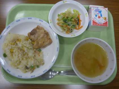 ピラフ・ポテトスープ・鶏肉のマリナード焼き・野菜サラダ・牛乳です。