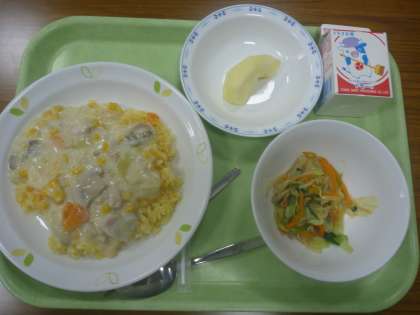 キャロットライスホワイトソースかけ・野菜サラダ・リンゴ・牛乳です。