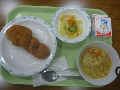 きな粉揚げパン・卵と野菜のスープ・ポテト入りフレンチサラダ・牛乳です。