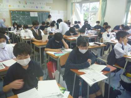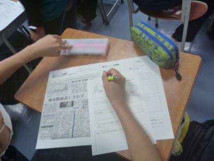 「私のニュース解説」各自が新聞から切り取ってきた記事についてまとめ、大人にインタビューをしてきた内容などをまとめて、ニュースキャスターになり切って、紹介する授業で、今プリントに各自まとめています。