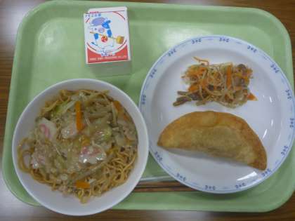 ちゃんぽん麺・かぼちゃの包み揚げ・糸こんにゃくともやしの和え物・牛乳です。
