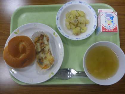ミルクパン・キャベツのコンソメスープ・白身魚のピザ風焼き・ジャーマンポテト・牛乳です。