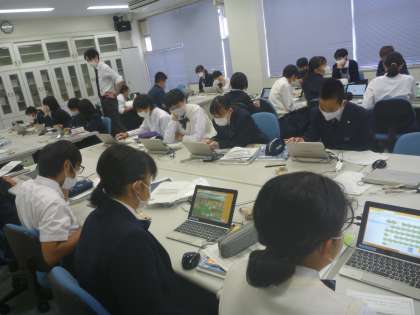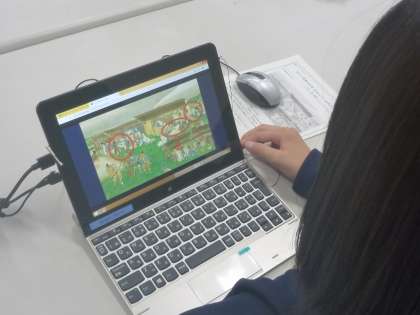 「武士と民衆の生活」の単元で、「鎌倉時代の生活」と「武士の生活」について、ロイロノートを使って、先生から送られてきた絵を見ながら、質問の答えを各自入力し、それをみんなで共有しながら、授業を行っています。
