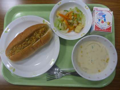 大豆ミートサンド・コーンポタージュ・ハニーサラダ・牛乳です。