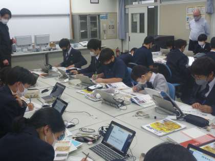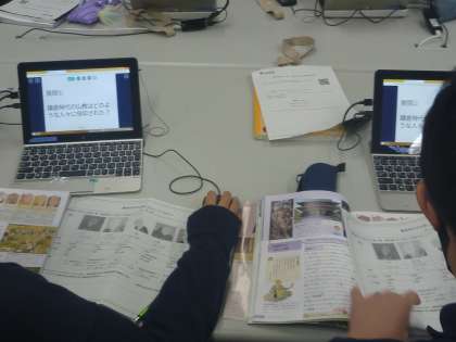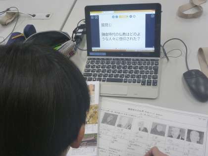 1年生社会は、「鎌倉時代の仏教」について。今日の質問は「鎌倉時代の仏教は、どんな人に信仰された?」に、資料集やプリントを参考に、各自考えを入力しています。