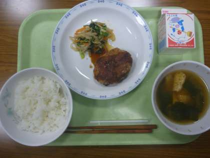 ご飯・みそ汁・里芋コロッケ・ごま和え・牛乳です。
