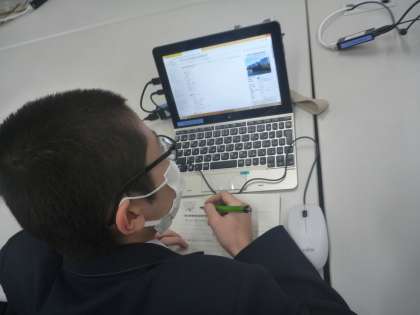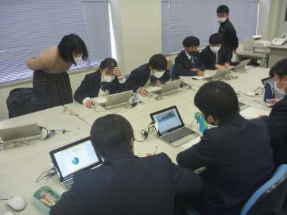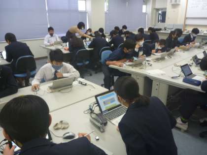 11月24日の5・6時間目に「高校の先生の授業」を受けるために、来ていただく都立晴海総合高校と都立第一商業高校について、各自パソコンで調べています。
