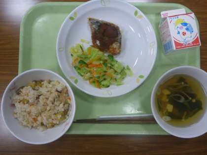 秋の香りご飯・すまし汁・鯖のみぞれかけ・野菜の即席漬け・牛乳です。
