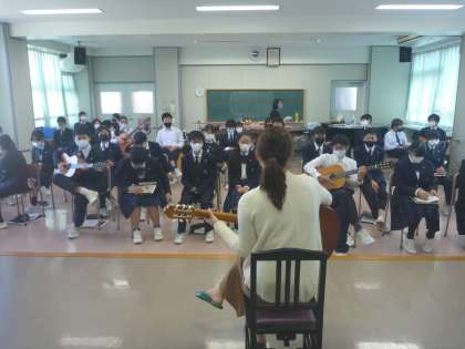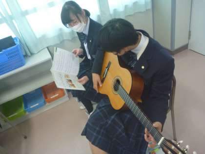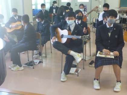 前回の4人1組の班に広がって、分かれて1番の人から引いて、2番の人が指のおさえ方の書いている教科書を見せています。