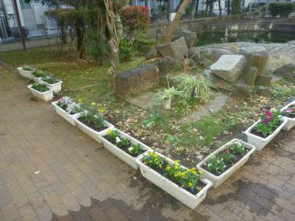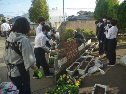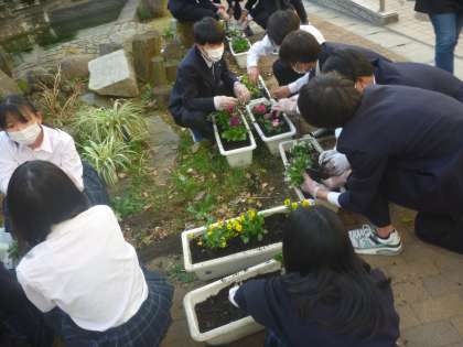 1・2年生は正門脇の地植えをしてくれています。3年生は、池の周りのプランターに。