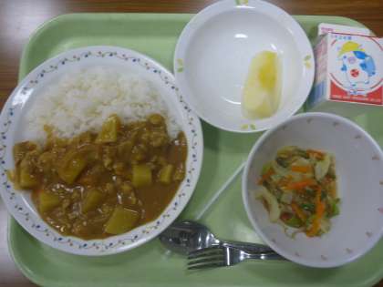 チキンカレーライス・こんにゃくサラダ・リンゴ・牛乳です。リンゴの美味しい季節になりました。