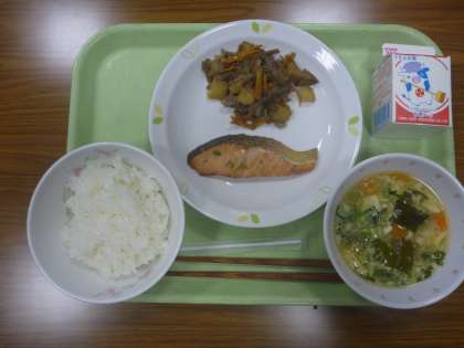 ご飯・かき玉汁・鮭の香味焼き・芋きんぴら・牛乳です。