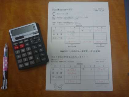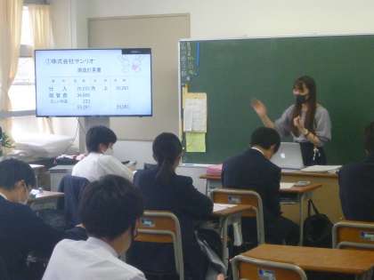まずB組は第1商業の商業の先生の授業で、「お店の利益を調べよう」ということで、有名な会社の例で各自計算しています。いつもと違ういい緊張感で、集中しています。