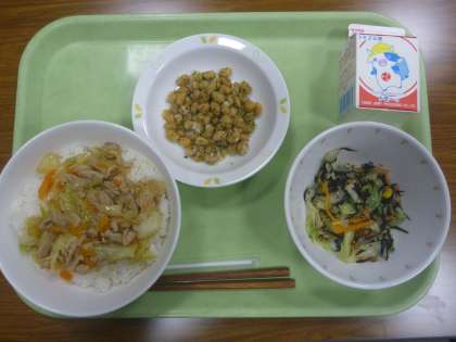 ねぎ塩丼・大豆の磯部揚げ・ひじきのピリっとサラダ・牛乳です。