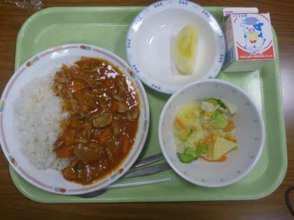 ハヤシライス・ポテト入りフレンチサラダ・リンゴ・牛乳です。
