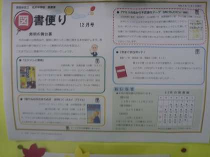 昨日、生徒に配布済みですが、今月の図書便りを廊下にも掲示しました。