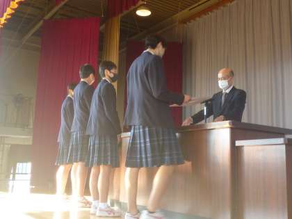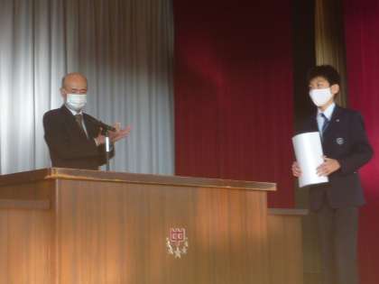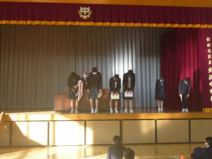 校長先生のお話のあと、区のバトミントン新人大会3位・一茶まつり俳句入選・バレー部都大会優勝の表彰がありました。
