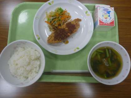 ご飯・みそ汁・鮭フライ・おひたし・牛乳です。