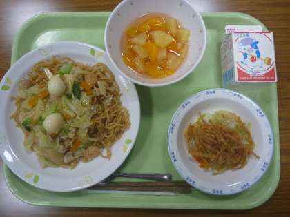 五目あんかけそば・ぱりぱりサラダ・フルーツポンチ・牛乳です。