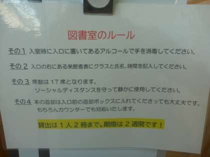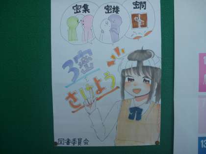 3蜜を避けるために、図書委員が書いたポスターや図書室のルールが入口に掲示されています。14日から冬休み用の貸出し5冊が始まっています。新着本も沢山あります。4回まで足を運んでみてはいかがでしょうか。