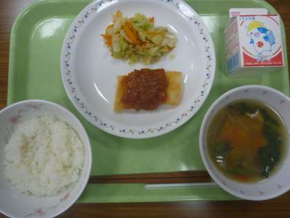 ご飯・豆腐団子スープ・いかのチリソース・野菜の中華味・牛乳です。