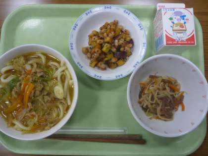 カレーうどん・糸こんにゃくともやしの和え物・お豆かりんとう・牛乳です。