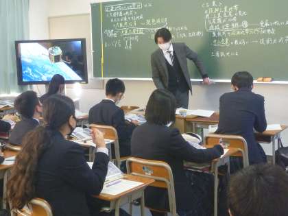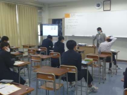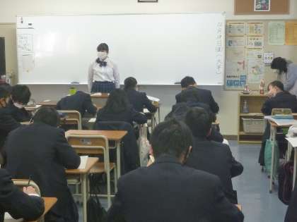 1年生国語は、1人ずつ前に出て、約90秒スピーチをしています。聞いている人は、スピーチで気になった所や声の大きさなどをプリントに書いています。