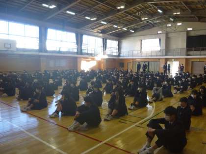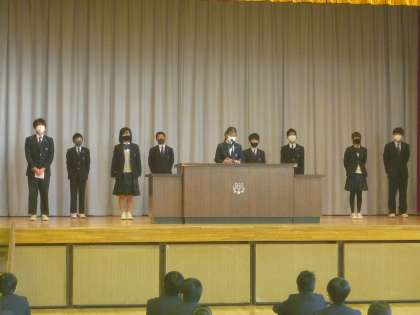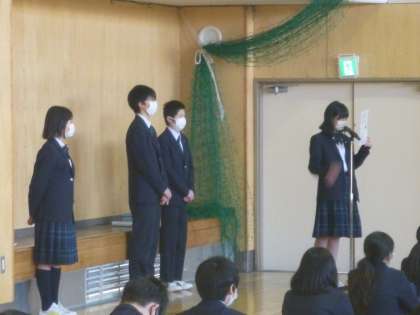 寒い朝ですが、みんな元気に登校し、生徒朝会を行いました。