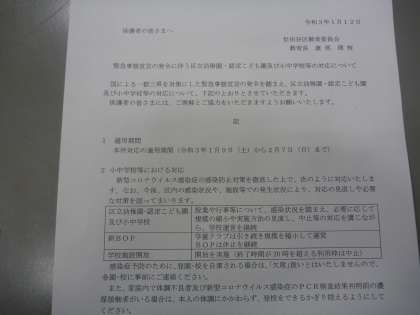 緊急メールでもお知らせしましたが、世田谷区の教育委員会から、「緊急事態宣言の発令に伴う区立幼稚園・認定こども園及び小中学校等の対応について」のプリントを本日生徒に配布しましたので、必ずご確認下さい。HPにも掲載しました。