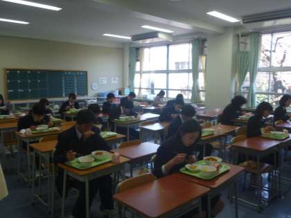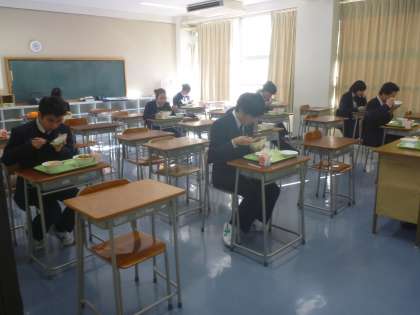 みんな分散給食で、黙々と食べています。