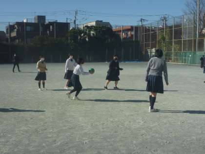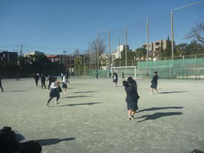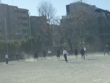 北風が冷たい校庭ですが、みんな元気にバレーやサッカーに笑いながら、走り回っています。
