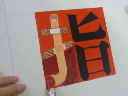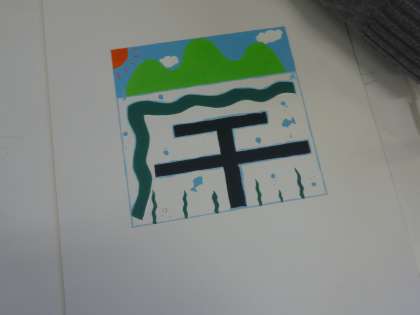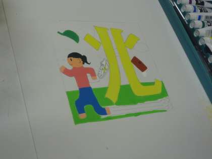 「絵文字」を書いています。自分が考えた下書きの通りに、絵の具で色付けをしています。