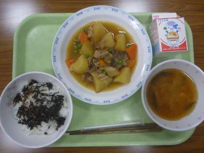 ご飯・ひじきふりかけ・みそ汁・肉じゃが・牛乳です。