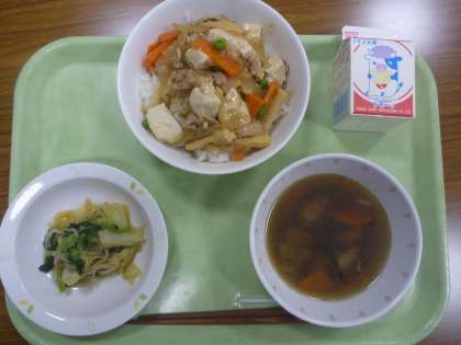 豆腐のうま煮丼・鰯のつみれ汁・野菜のからし和え・牛乳です。