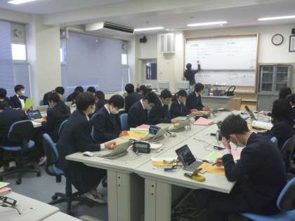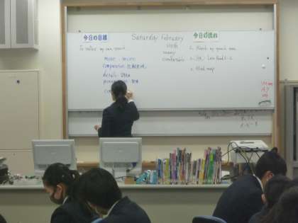 2年生英語は、パソコン室でロイロノートを使って、プレゼンテーションで「好きなこと・もの」について、それぞれ作成をしています。
