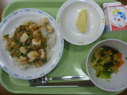 麻婆豆腐丼・ねぎだれ中華サラダ・リンゴ・牛乳です。