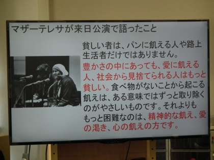 日本にマザーテレサがいらしたとき、「皆さん、心は満たされていますか?」と質問され、精神的な心の安定が大切だということをお話しされたそうです。