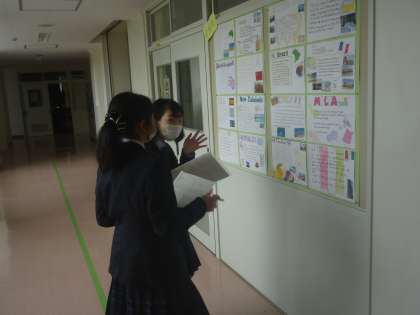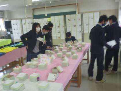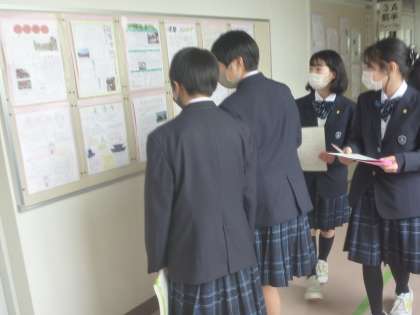 展示見学。気に入った作品を各自展示見学カードに記入しています。