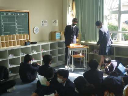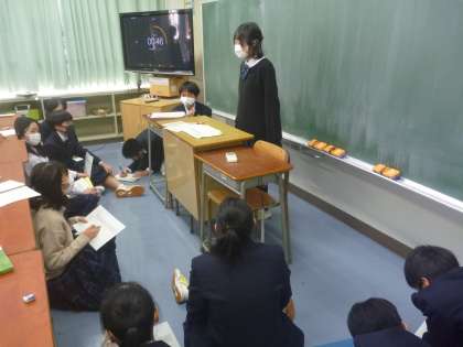 今年1年間国語で学習した内容について、各自3分ずつ3つのグループに分かれて、行っています。聞いている人は、評価カードに、目線や話し方・内容などを評価しています。