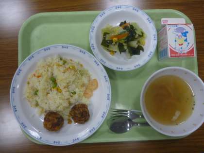 ピラフ・コンソメスープ・豚肉のコーンフレーク揚げ・海藻サラダ・牛乳です。