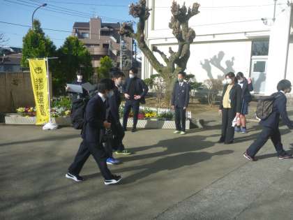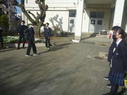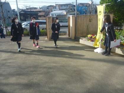 晴天の正門で、生徒会役員と生活委員が、元気よく「おはようございます」とあいさつしていました。