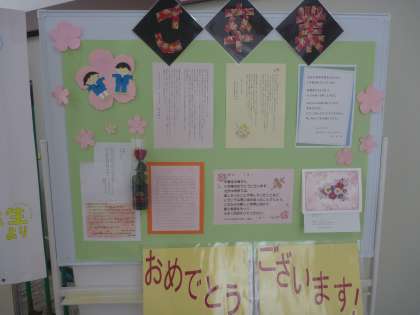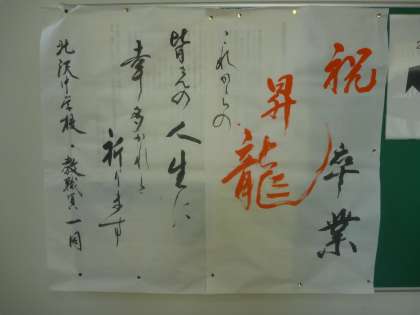 保護者入口には、校長先生が書かれた書が。体育館入口には、祝辞が沢山掲示されています。
