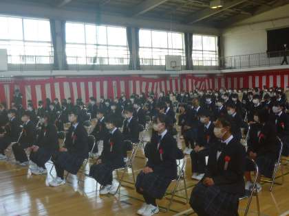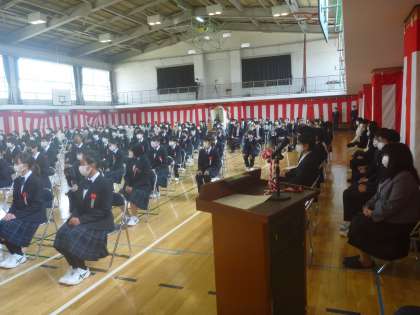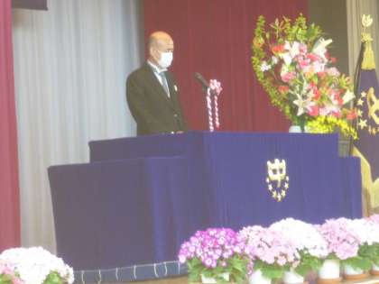 校長式辞。豊かな感受性を身に着けて、これから出会う人の良さに気づき、周りの人に「素晴らしい」と感動を与えられる人になって下さい。「marvelous(マーベラス)」この言葉を送ります。「疾風に勁草を知る」という言葉を送ります。意味は、困難や試練に直面したときに、はじめてその人の意思の強さや節操の堅固さ、人間としての値打ちがわかることのたとえ。強い意志があれば、どんな困難の乗り越えられます。充実感を保つには、ひと手間かける。その積み重ねが、豊かな人生となるので、そのための改善や努力が大切です。自分でどうしたらいいか考え実行しましょう。成功のカギはやり抜く力。心のトレーニングを続けましょう。どこまで克服できるかがあなたの強みになります等のお話をみんな真剣に聞いていました。
